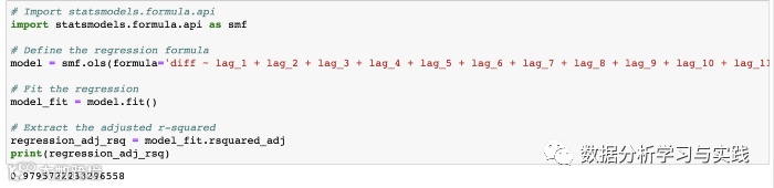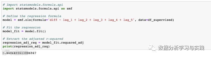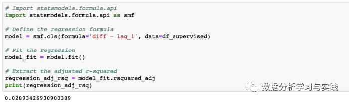 基本上,我们拟合线性回归模型(OLS-普通最小二乘)并计算调整后的R平方。对于上面的示例,我们仅使用lag_1来查看它能解释diff列中的变化的程度。该代码块的输出为: