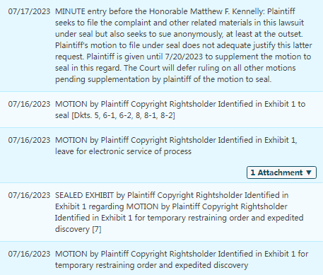 MOTION by Plaintiff Copyright Rightsholder Identified in Exhibit 1 to seal [Dkts. 5, 6-1, 6-2, 8, 8-1, 8-2]