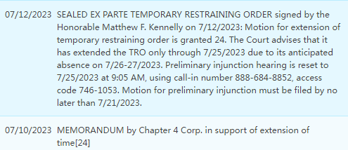 SEALED EX PARTE TEMPORARY RESTRAINING ORDER signed by the Honorable Matthew F. Kennelly on 7/12/2023: Motion for extension of temporary restraining order is granted 24. The Court advises that it has extended the TRO only through 7/25/2023 due to its anticipated absence on 7/26-27/2023. Preliminary injunction hearing is reset to 7/25/2023 at 9:05 AM, using call-in number 888-684-8852, access code 746-1053. Motion for preliminary injunction must be filed by no later than 7/21/2023.
