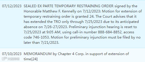 伊利诺伊州法院已经批准延长临时限制令的动议,将其延期至2023年7月25日。因为预计TRO将于2023年7月26日至27日缺席。