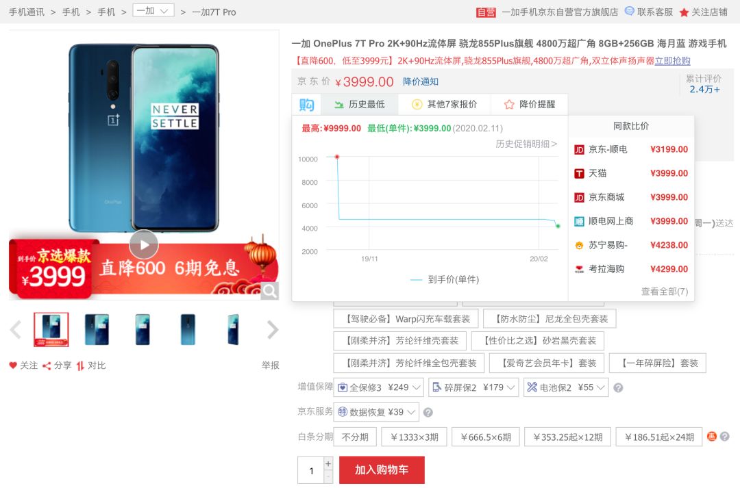 值得一提的是,看到一加8系列可能提前发布的消息,小白去京东瞅了一眼,发现一加7T系列不知道啥时候进行了降价促销,一加7T Pro 8+256GB由发售价的4599直降600元到手价3999元,一般一加旗舰降价往往意味着为新旗舰让路,看来一加8确实有提前发布的意思~
