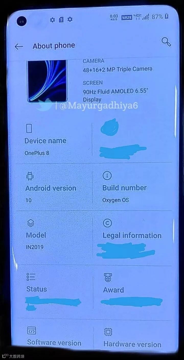 @Mayurgadhiya6分享的谍照显示,一加8标准版或采用6.55英寸Fluid AMOLED左上角单挖孔曲面屏,90Hz屏幕刷新率,后置三摄48MP+16MP+2MP(相机比一加7T还不如,所以个人觉得真实性待确认)。