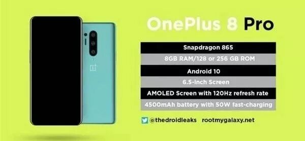 而thedroidleaks曝光的一加8 Pro渲染图就和之前差不多,6.5英寸120Hz屏,搭载骁龙865(这个闭着眼睛都能猜到),电池容量为4500mAh,充电升级到了50W快充。