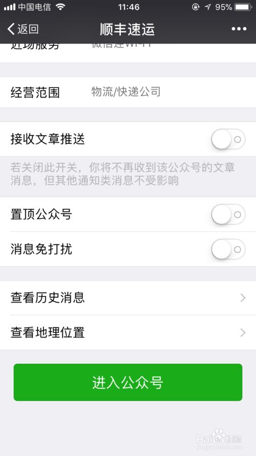 ①在微信中搜索“顺丰速运”公众号、关注,并进入公众号