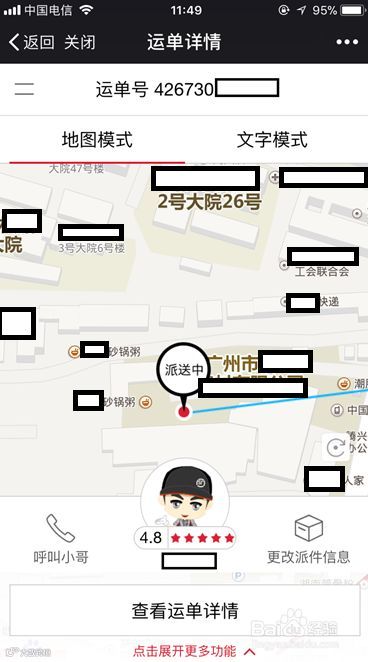 ⑤此时进入【运单详情界面】,默认显示地图模式,显示快递当前所在地点及状态(如派送中)