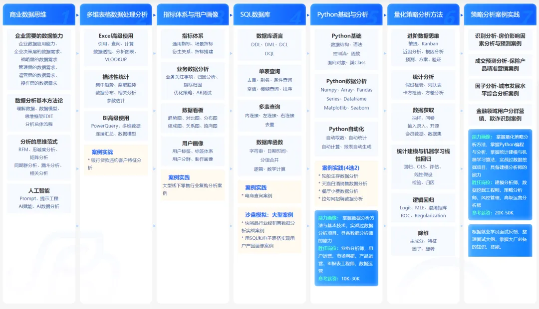 工具与思维预备:预习阶段提供Excel、数据库、PowerBI等工具的预习视频,帮你提前熟悉工具操作。业务前台人员数据思维训练营则培养你的数据思维,为后续学习打下坚实基础。 -