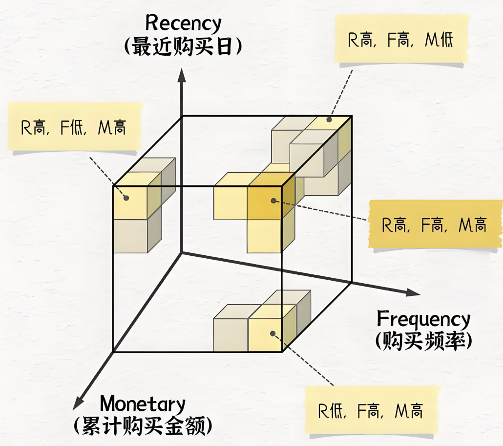 3、RFM模型:基于最近消费时间(Recency)、消费频次(Frequency)、消费金额(Monetary)的客户分层,识别高价值客户(如R低、F/M高的客户需重点维护)。