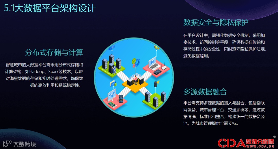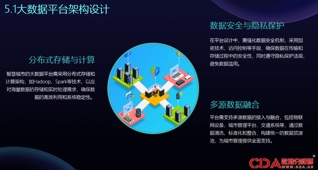 智慧城市的大数据平台多采用分布式存储,例如一些新的技术,以满足海量数据的存储和实时处理需求,确保数据的高效利用以及系统的稳定性。