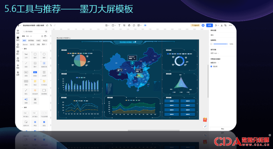 此外,推荐大家可使用墨刀的大屏模板,其中包含扇形图、模块标题、折线图等不同内容,左侧有目录和组件,可展示图表类型、表格类型、信息流等,非常便捷。