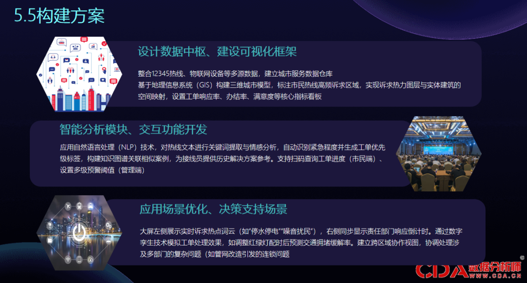 例如,可结合 12345 热线留存多元数据,建立整体数据仓库,基于地理位置构建三维城市模型,标注高频诉求区域,实现热力图和实体建筑的空间映射,并设置热线响应率、办结率、满意率、满意度等指标。