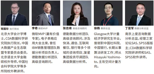 师资团队汇聚学界、实务界的专家讲师、企业资深分析师和行业大牛,代表着国内数据分析培训的顶尖水平。他们不仅拥有深厚的理论知识,还具备丰富的实战经验,能将晦涩的理论知识融入实际案例中讲解,让你轻松理解。在学习过程中,以问题为导向,引导你深度思考,提升解决复杂问题的能力,培养敏锐的数据思维和扎实的数据素养。
