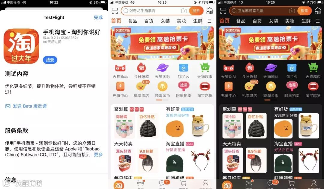 具体体验方式:①复制蓝字链接打开https://testflight.apple.com/join/TThGL9RX,通过苹果testlight安装(仅支持iOS13系统)②打开系统设置-显示与亮度-深色,再打开淘宝即可体验深色模式。