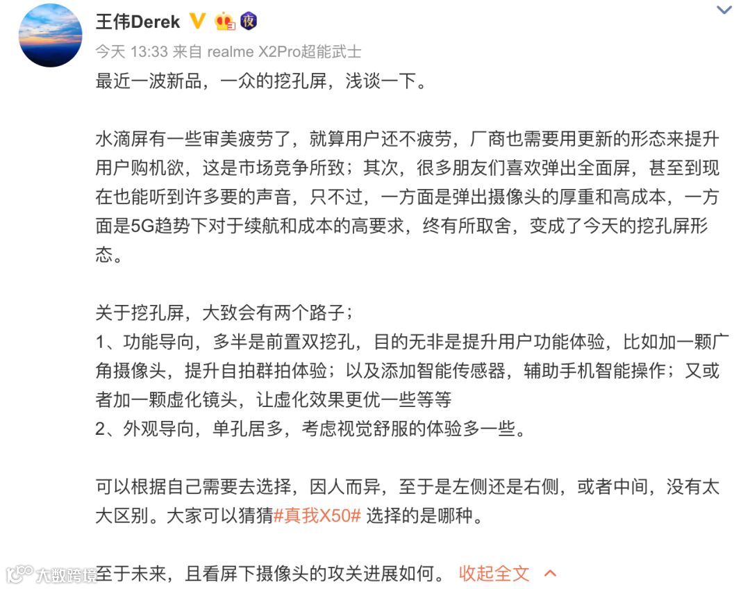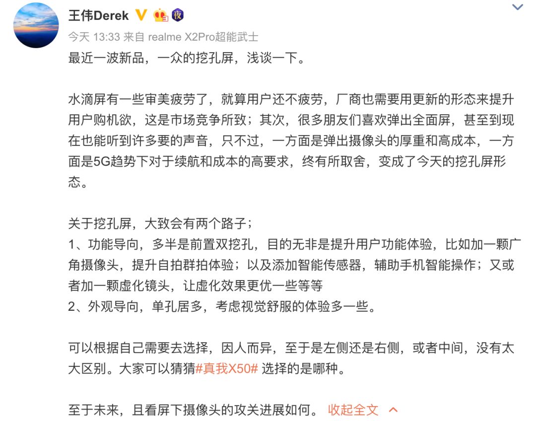并表示「很多朋友们喜欢弹出全面屏,甚至到现在也能听到许多要的声音,只不过,一方面是弹出摄像头的厚重和高成本,一方面是5G趋势下对于续航和成本的高要求,终有所取舍,变成了今天的挖孔屏形态。」