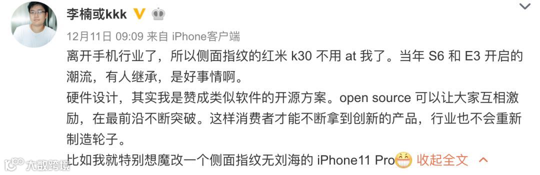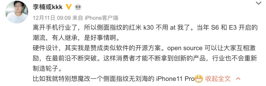 李楠表示:已经离开手机行业,所以侧面指纹的红米K30不用@他了。同时还评价称「当年魅族S6和E3开启的潮流,有人继承,是好事情啊。」他赞成硬件设计有类似软件的开源方案,可以让大家互相激励,在最前沿不断突破。这样消费者才能不断拿到创新的产品,行业也不会重新制造轮子。并调侃特别想魔改一个侧面指纹无刘海的iPhone 11 Pro。