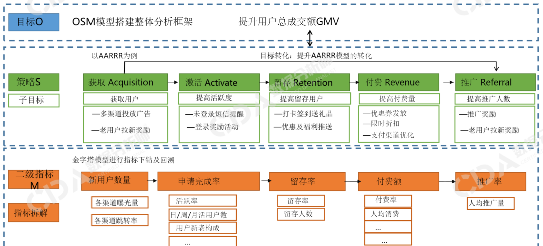 以提升GMV为例,通过AARRR模型(获客、激活、留存、付费、推广)拆解指标,逐层细化到每个业务环节的具体指标。