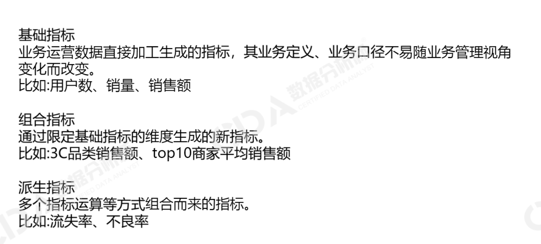 基础指标:业务运营数据直接加工生成的指标,如用户数、销售额。 -
