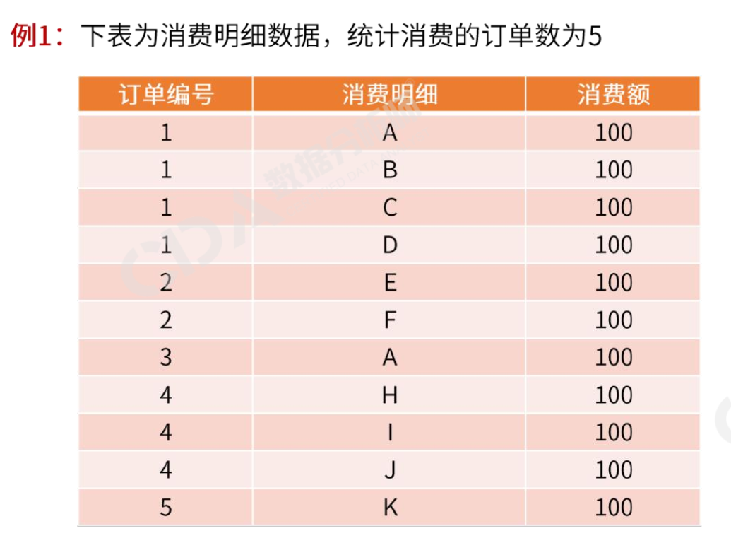 非重复计数:去重后的计数,例如统计不同产品的订单数。
