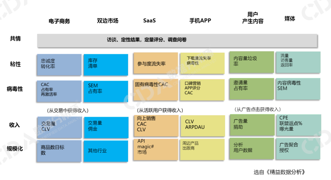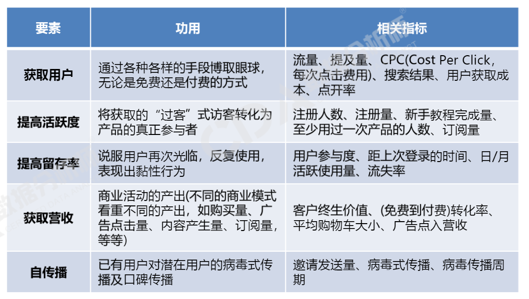 客户分析:如增长黑客模型中的获客成本、客户留存率、客户生命周期价值等。