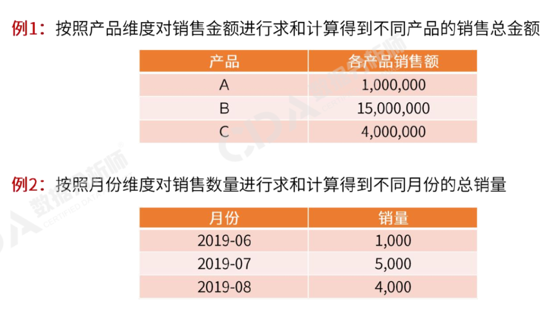 常规求和:对度量求和,例如按产品维度计算销售总金额。 -