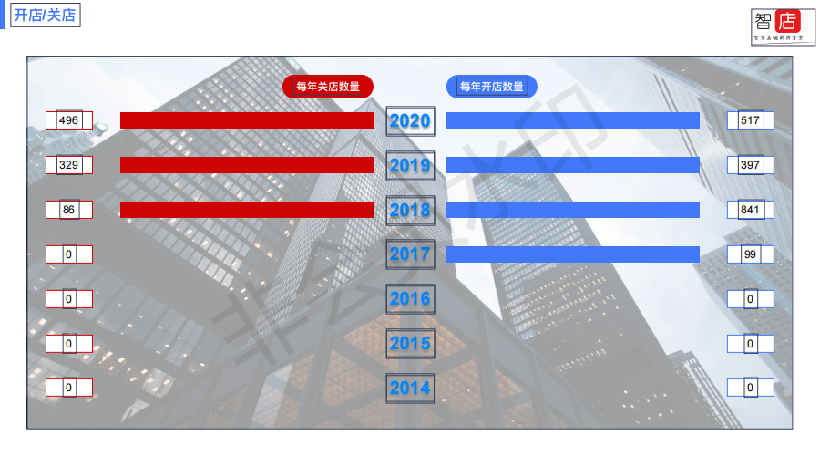 在2014-2020年,品牌开店数量普遍高于关店数量,整体是上升趋势,市场曝光率上升状态。