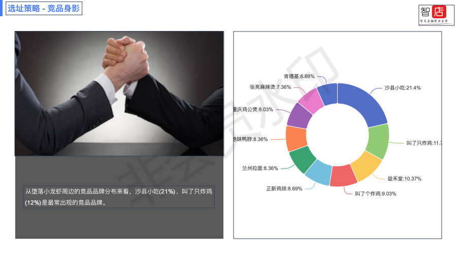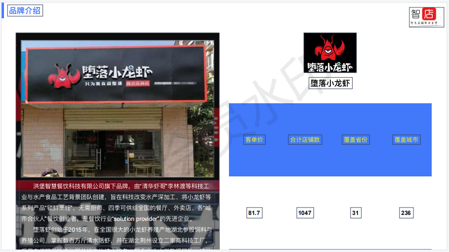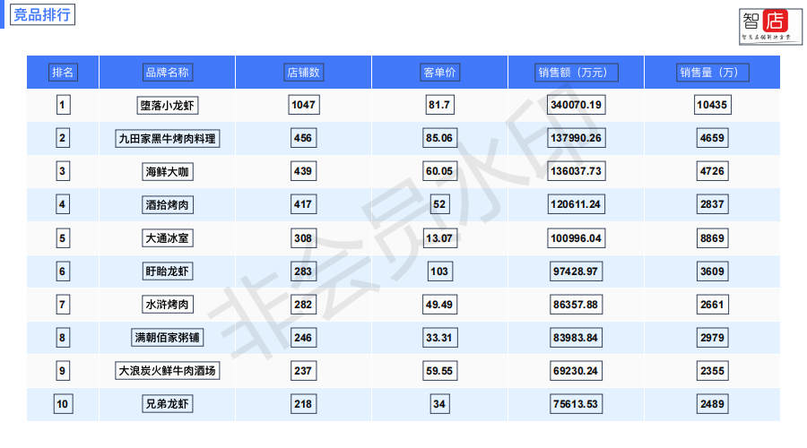 在竞品排行中,堕落小龙虾取得了遥遥领先第一的市场地位,这与它的开店数量、市场占有率有关。
