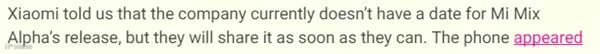 目前小米暂时未回应相关情况,但据外媒Abacus报道,小米方面向其表示,MIX Alpha尚未有确切的发售时间,他们会在准备妥当后第一时间对外公布。或许是出于保障用户最终体验的缘故,小米显得极为谨慎。