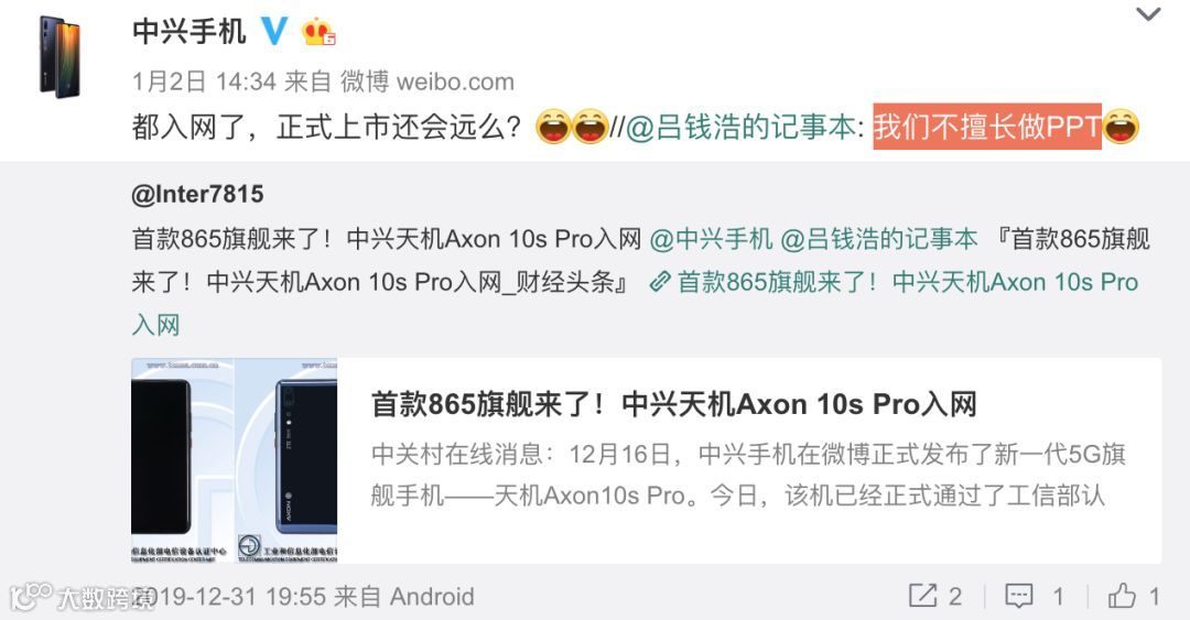 中兴通讯消费者体验部部长吕钱浩近日在微博上表示:「我们不擅长做PPT」「都入网了,正式上市还远吗?」等等。潜台词就是:中兴天机Axon 10s Pro很快就会上市,首发865板上钉钉。