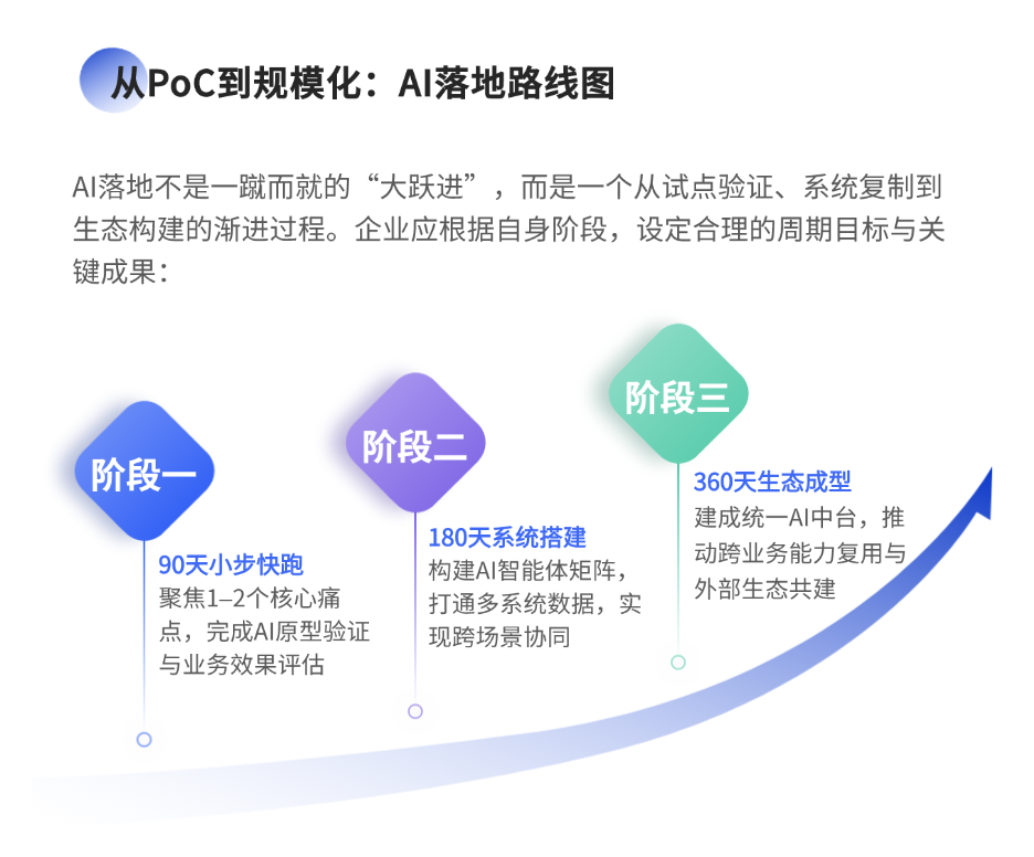 AI落地不是一蹴而就的“大跃进”,而是一个从试点验证、系统复制到生态构建的渐进过程。企业应根据自身阶段,设定合理的周期目标与关键成果:
