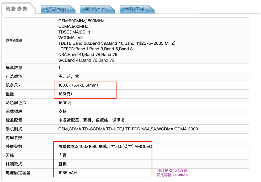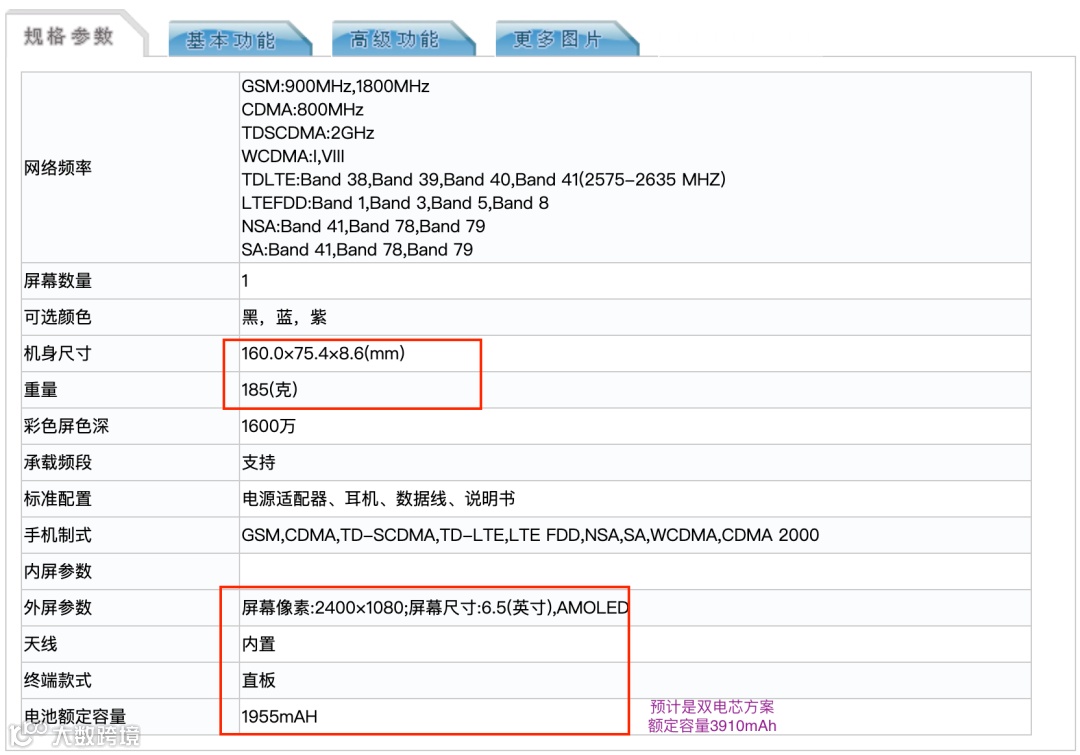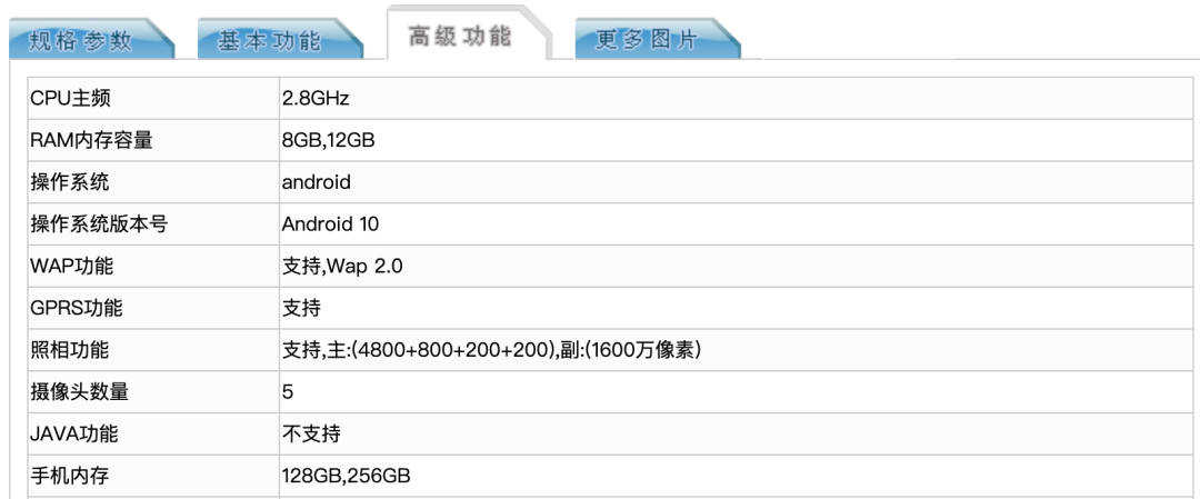 大家最关心的处理器,工信部显示其支持NSA和SA双模5G,搭载主频为2.8Ghz的八核处理器,应该是骁龙865 而非传闻中的首发天玑1000~ (天玑1000大核主频最高是2.6GHz~)另外,其提供8/12GB + 128/256GB几个储存规格。