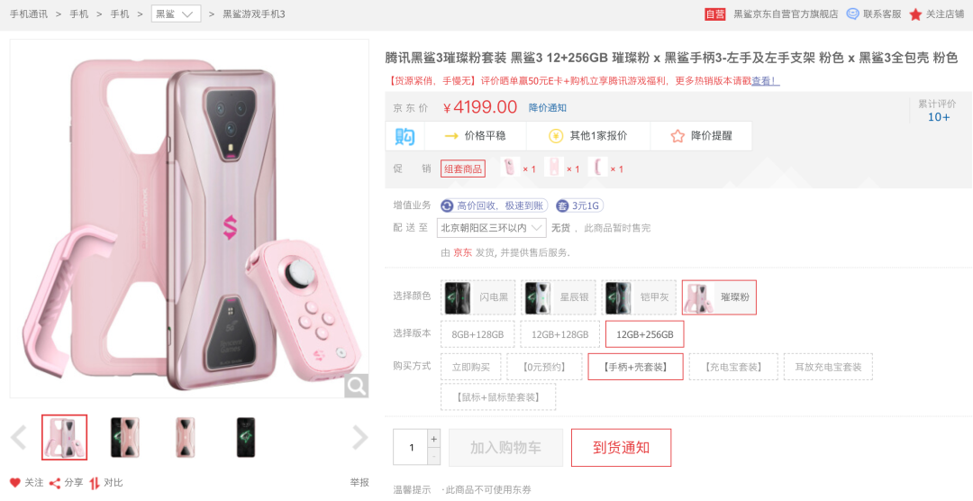 目前黑鲨3的璀璨粉套装已经售罄,官方暂时没公布何时第2轮销售,感兴趣的小伙伴可以多关注一下黑鲨官博~
