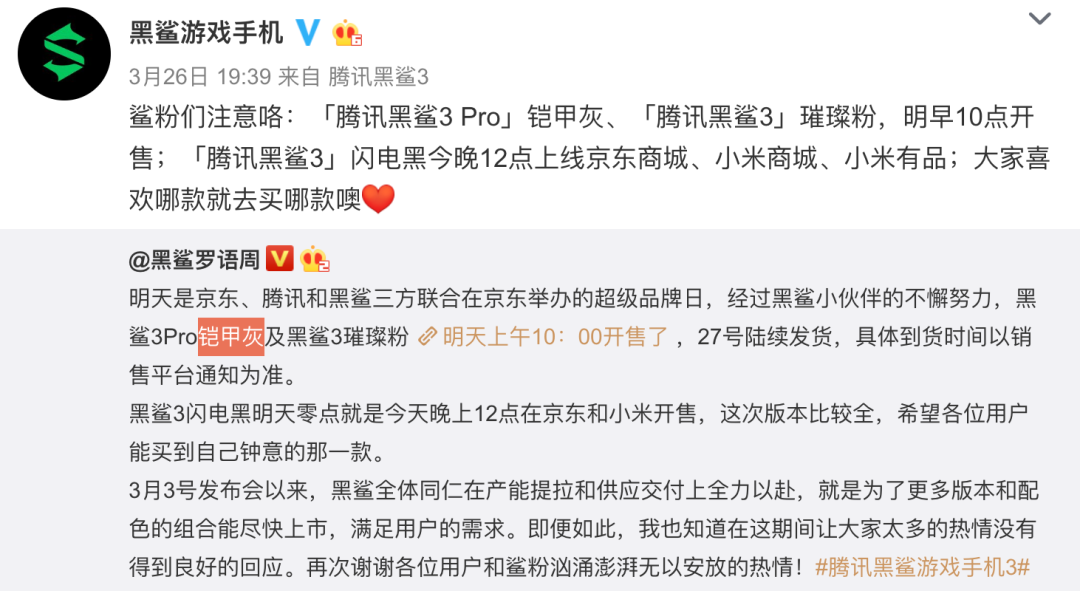 首先是黑鲨这边,早前宣布受备货不足等因素宣布