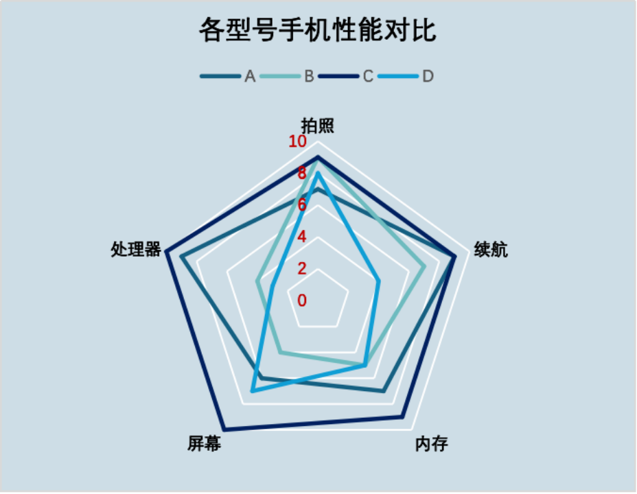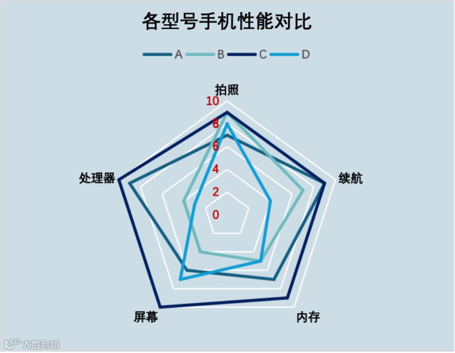 多维度对比---多个维度同时比较。例如,比较不同型号手机在拍照、续航、内存、屏幕、处理器等方面的综合表现。
