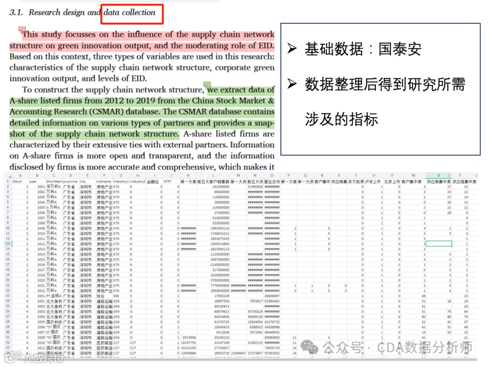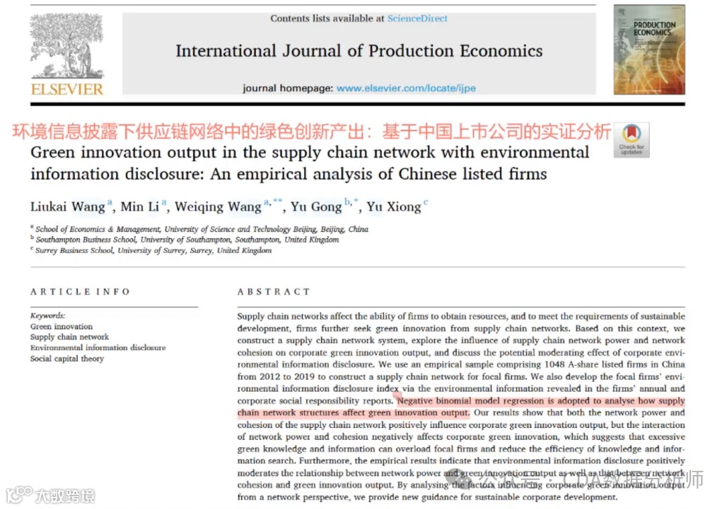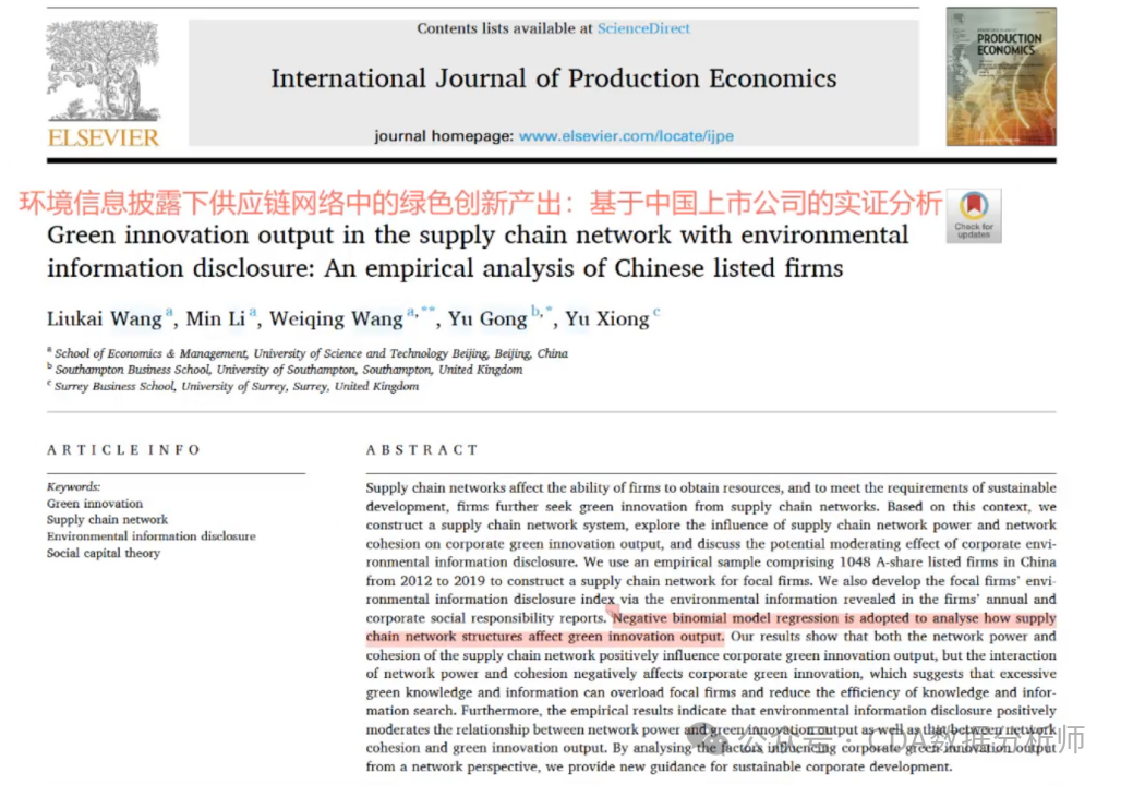 这一篇文章题目直译可能较为抽象,但它发表在知名期刊上,探讨了环境信息披露对供应链网络中绿色创新产出的影响。这篇文章是基于中国上市公司的实证分析,主要研究网络结构对企业绿色创新产出的影响。研究采用了负二项回归模型进行分析。数据主要来自国泰安数据库,涵盖了2012年至2019年A股上市公司的详细信息,包括供应链网络结构。研究强调了供应链网络结构对绿色创新产出的影响,并考虑了环境信息披露(EID)的条件效应。从国泰数据库中提取的数据包括了不同合作伙伴的详细信息,数据整理后得到研究所需的指标。