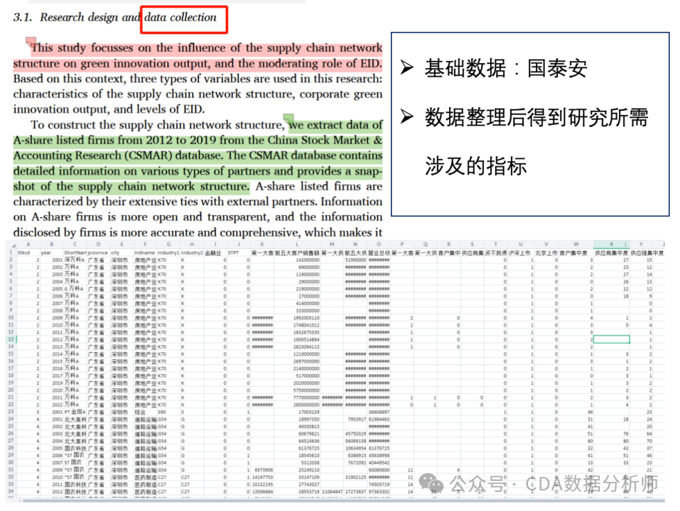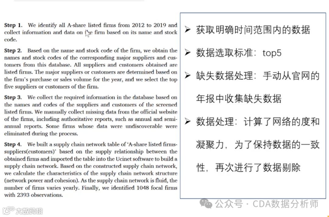 在数据处理方面,研究者进行了数据清洗,这个过程包括了明确的步骤,类似于科研数据分析中常用的方法。研究者首先描述了获取的数据的时间范围和类型,包括A股上市公司的详细信息,如公司名称和股票代码。接着,从数据集中选取了每个企业的前五大供应商和前五大客户数据,并解释了选择这些数据的原因。