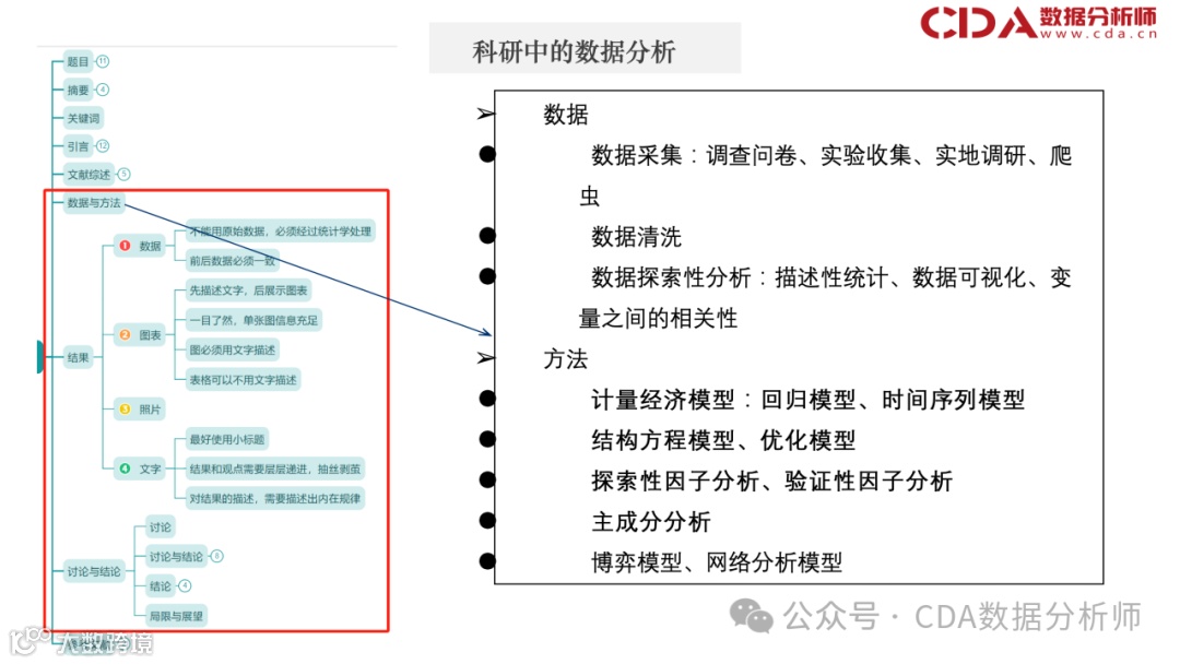 科研与数据分析师日常工作有所不同,但也有相似之处。科研的成果通常是论文,包括题目、摘要、关键词、引言、文献综述、数据与方法、结果、讨论、结论和参考文献。其中,红框标记的部分与数据分析紧密相关。除了综述性文章,几乎所有论文都需要数据和方法的支持,通过这些来得出结果并进行深入讨论,类似于数据分析中的策略性工作。