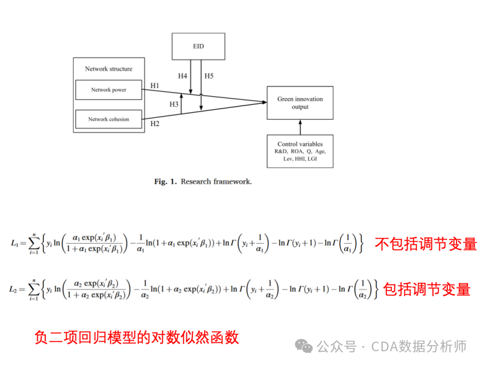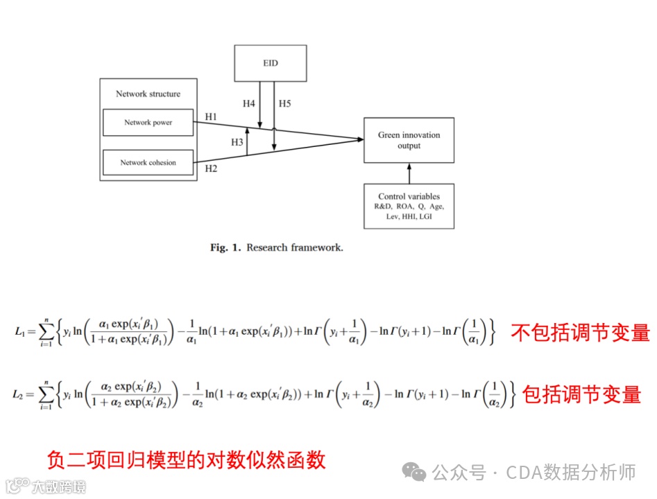 接着,它构建了自己的模型,包括核心解释变量、被解释变量、控制变量以及调节变量。使用负二项回归模型进行建模,建立了两个模型,一个不包括环境信息披露(EID)变量,另一个包括,以做对比。