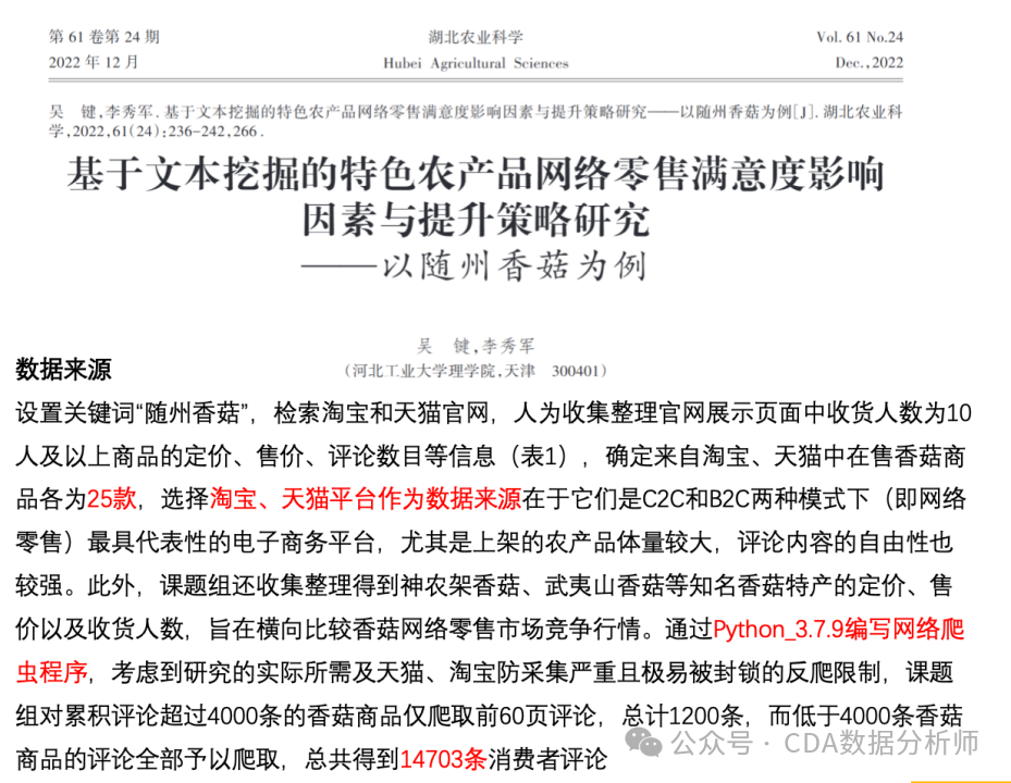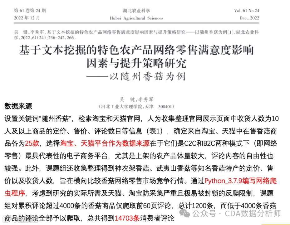 我们来看一个例子,这是一篇关于特色农产品网络零售满意度影响因素的研究。文章的数据来源并非传统的调查问卷或访谈,而是通过网络爬虫技术获取的。研究者选择了25款产品,并以两个电商平台为数据源,使用Python编写爬虫程序收集了大量消费者评论数据。