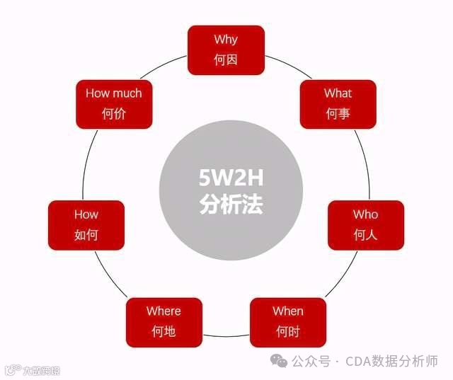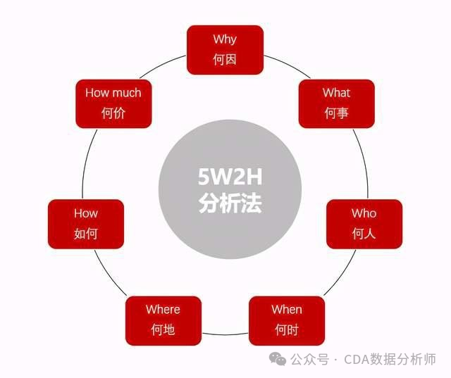 5W2H分析法是以五个W开头和两个H开头的英语单词进行提问,从回答中发现解决问题的线索,即何因(Why)、何事(What)、何人(Who)、何时(When)、何地(Where)、如何(How)、何价(How much),这就构成了5W2H分析法的总框架。