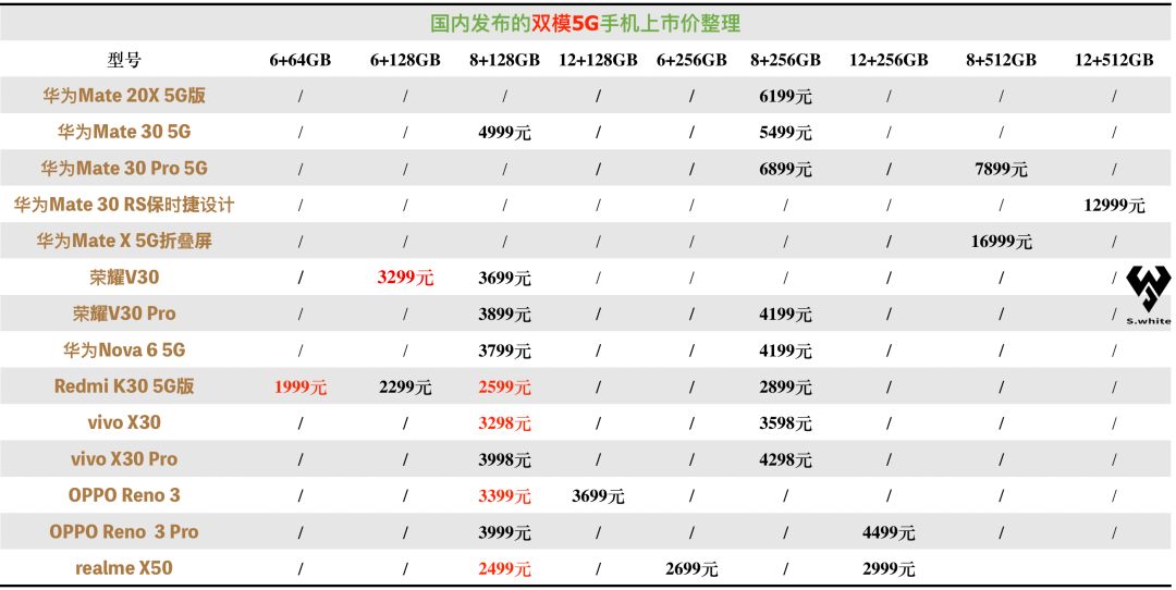 附上小白之前制作的双模5G手机价格汇总,目前最便宜的双模5G手机是Redmi K30 5G版,6+64GB售价1999元。而vivo Z6的上一代vivo Z5是6+64GB起步售1598元,这次vivo Z6升级为5G不知道是否会涨一点,坐等明天上午公布价格了。