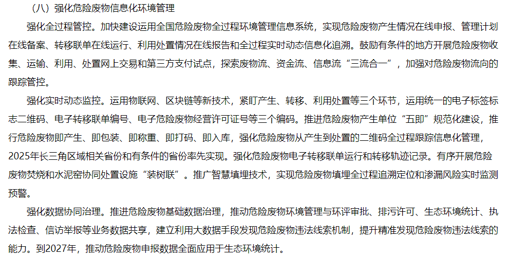 《指导意见》强调:运用物联网、区块链等技术,对危险废物产生、转移、利用处置等环节实施实时动态监控。通过统一编码,实现全过程信息化跟踪管理。同时,强化电子转移联单运行和轨迹记录,开展设施“装树联”,推广智慧填埋技术,实现填埋过程追溯定位和渗漏风险实时监测预警。