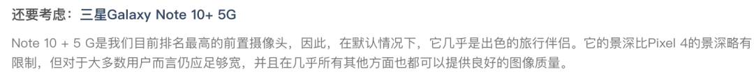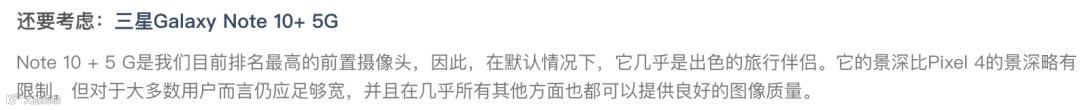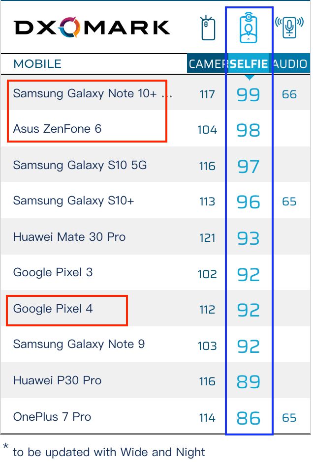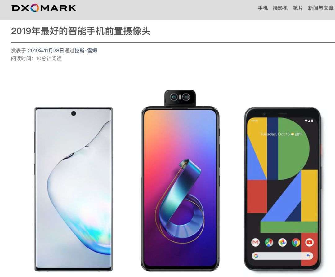 简单总结下:DxOMark给出的最佳手机前置相机全能选手 三星Galaxy Note 10+ 5G、 最适合视频的前置 三星Note 10+ 5G,最适合旅行的前置 谷歌Pixel 4、最适合近摄 华硕ZenFone 6、最适合集体照的前置 谷歌 Pixel 4、