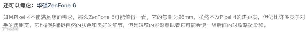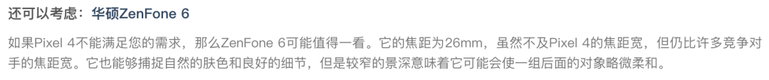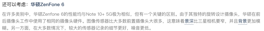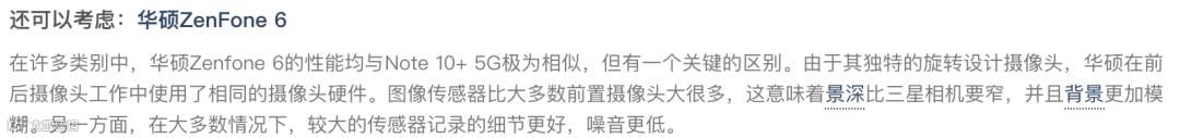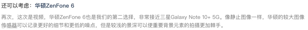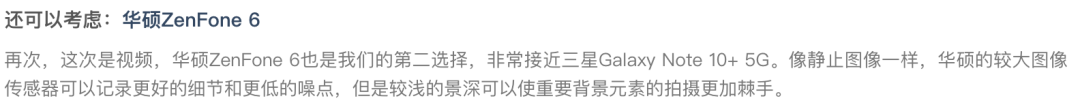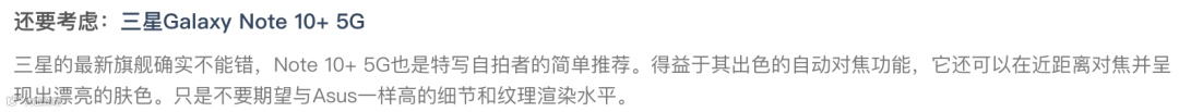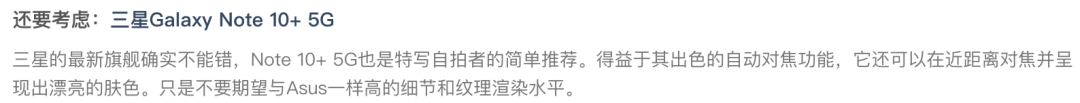 而各项被DxOMark列为次选考虑的分别是,前置相机综合 华硕ZenFone 6、适合视频的 前置 华硕ZenFone 6,适合旅行的前置 三星Note 10+ 5G、适合近摄 三星Note 10+ 5G、适合集体照的前置 华硕ZenFone 6。