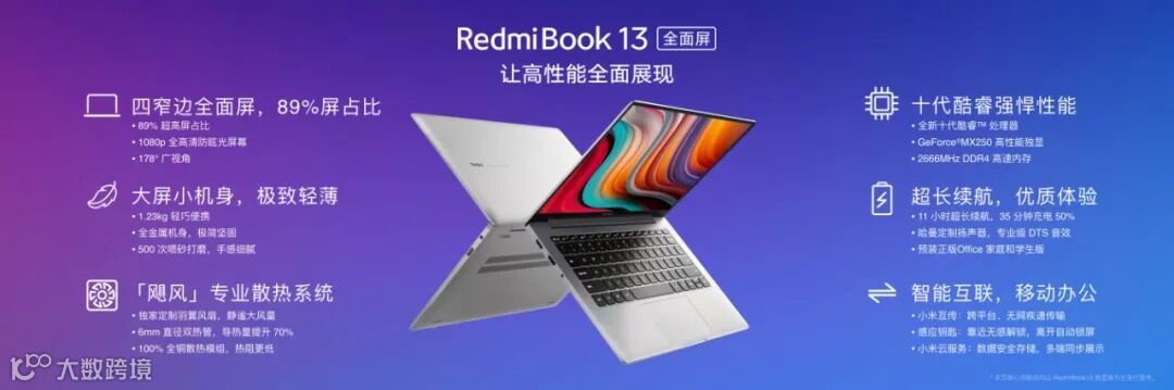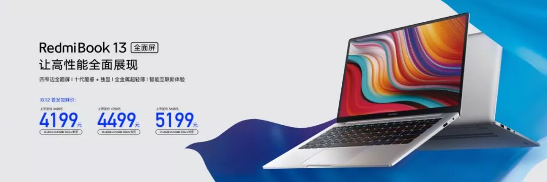 配置上,官方表示RedmiBook13全面屏 超轻本采用四窄边全面屏,89%超高屏占比,全系标配第十代英特尔®酷睿™处理器,11个小时超长续航,搭载 GeForce® MX250 独立显卡,2GB GDDR5 高速显存,支持小米手环解锁,小米互传跨平台传输智能移动办公。