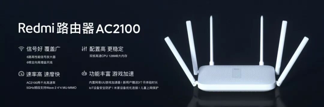 配置上,官方表示Redmi路由器AC2100无线速率高达两千兆,5G频段速率是AC1200路由器两倍;6根全向高增益天线,6路高性能信号放大器;双核四线程CPU,128MB大内存,最多可稳定连接128台设备;内置网易UU游戏加速器,全球多平台主流游戏加速;为小米智能家居设备优化连接,配合米家APP,无需输入密码即可入网。