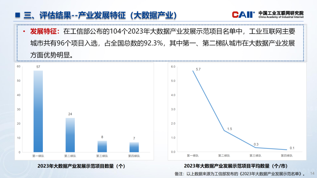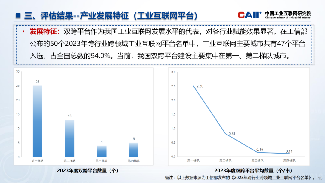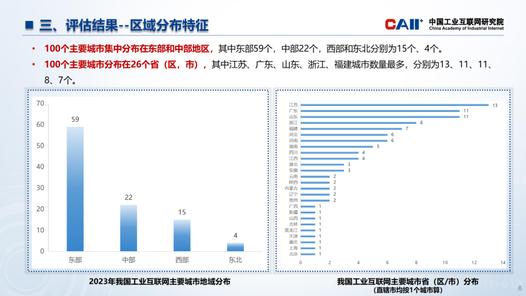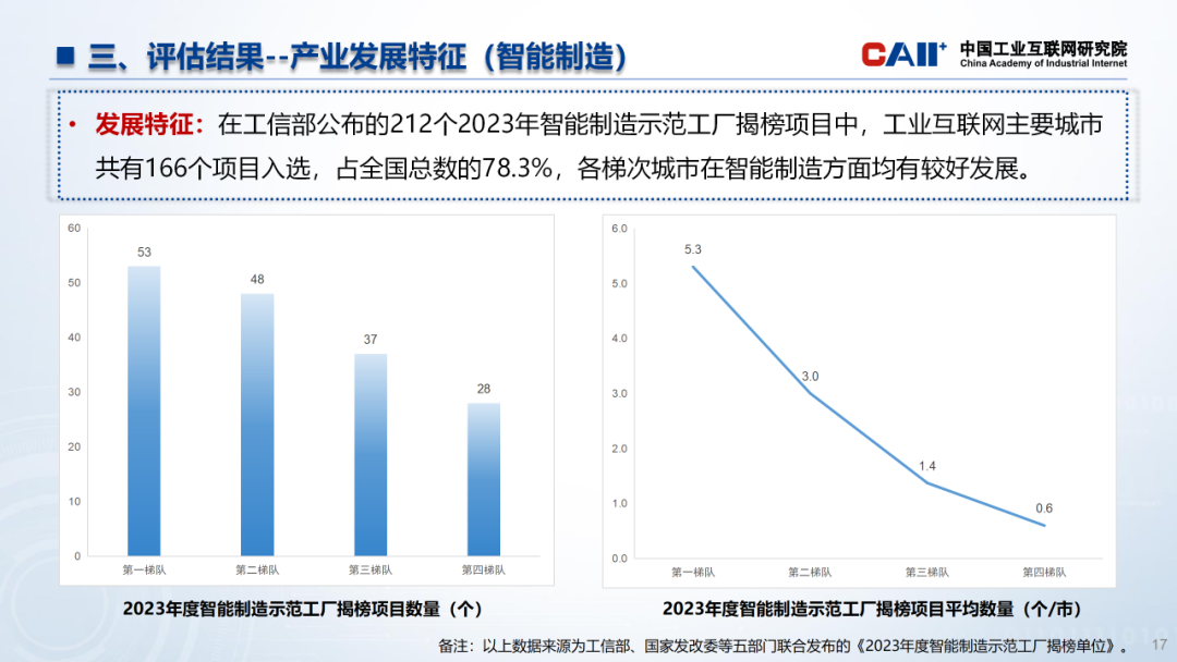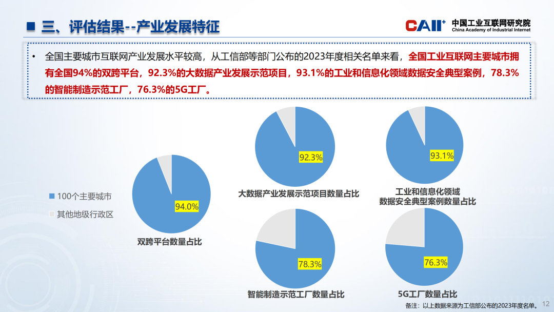 《报告》显示,从产业发展特征来看,100个全国工业互联网主要城市互联网产业发展水平较高。从工信部等部门公布的2023年度相关名单来看,全国工业互联网主要城市拥有全国94%的双跨平台、92.3%的大数据产业发展示范项目、93.1%的工业和信息化领域数据安全典型案例、78.3%的智能制造示范工厂、76.3%的5G工厂。