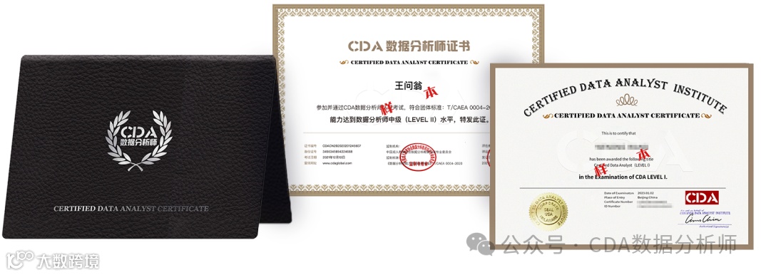 CDA认证标准由数据科学领域的专家、学者及众多企业共同制定并每年修订更新,确保了标准的科学性、专业性、国际性、前沿性。通过CDA认证考试者可获得CDA中英文认证证书。