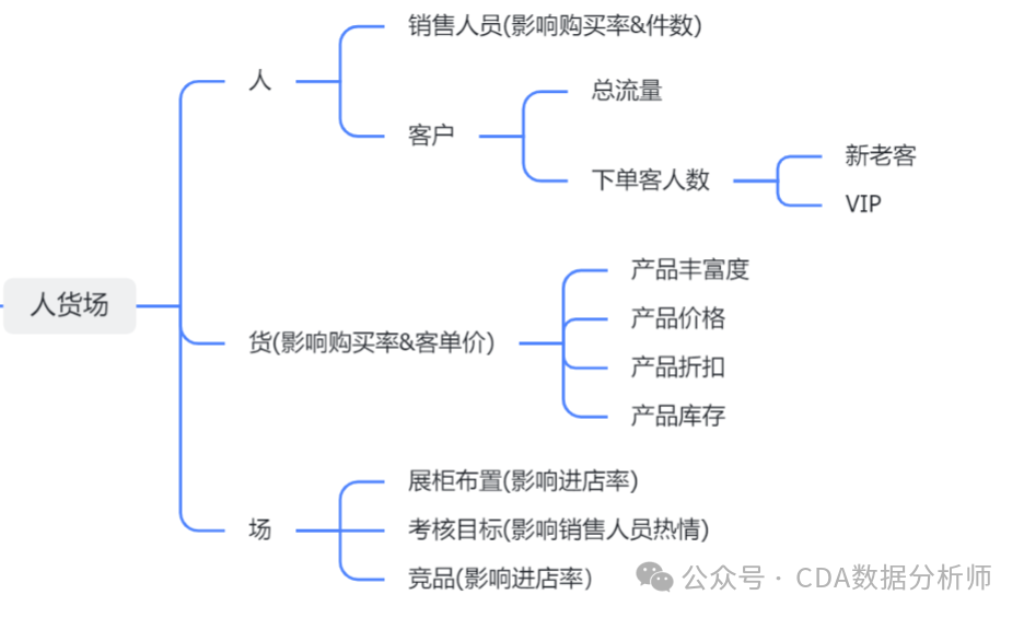 数据分析的核心是在数学公式以外,还存在业务逻辑。数学公式不是万能的,还需要结合业务场景来仔细列出所有能够想到的因素。这里用人货场的思维来做分析: