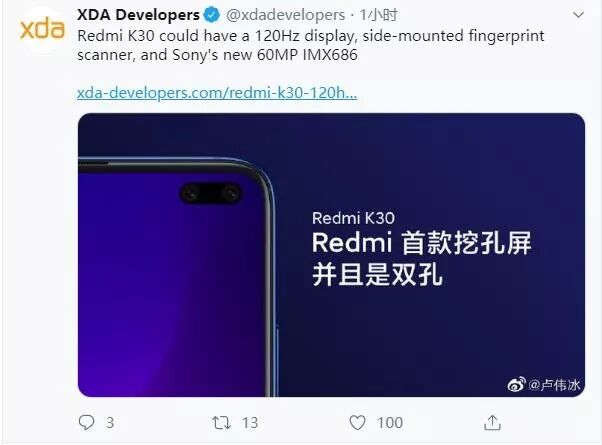 近日XDA还有消息称,Redmi K30的代号可能是“Phoenix(凤凰)”,该代号日前就有许多爆料,并表示“Phoenix”将搭载120Hz屏幕刷新率的屏幕,侧边指纹,主摄使用索尼IMX686传感器(曝6000万像素,1/1.7英寸大底),但最终是否是Redmi K30尚不好说,蹲官方12月发布就完事了~