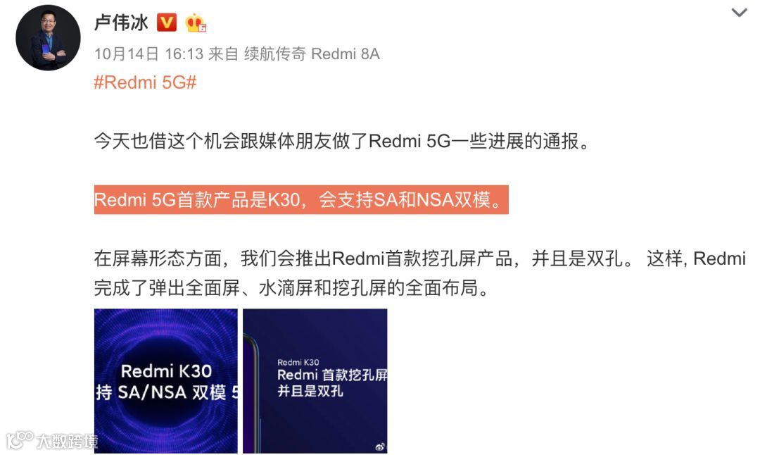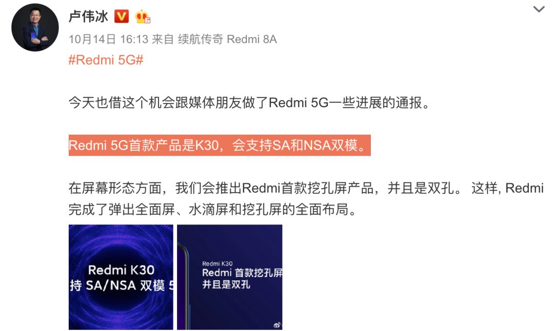 配置上,据之前卢伟冰预热,Redmi K30系列将会是Redmi首款双模5G手机,支持SA/NSA,同时也是Redmi首款挖孔屏(右上角双挖孔)。爆料称Redmi K30似乎和荣耀V30一样都是LCD屏+侧边指纹,而非传闻中的OLED屏+屏幕指纹。