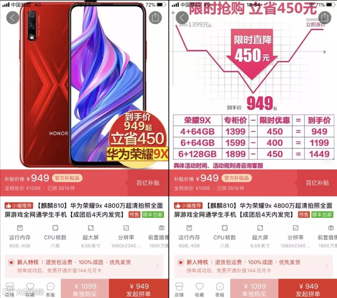 另一边,拼多多的百亿补贴活动 荣耀9X 最低价949元即可到手,比官方价便宜了450元。参数上,荣耀9X系列采用升降6.59英寸LCD屏,前置1600万像素,4000mAh+10W快充,有3.5mm耳机孔,不支持NFC,不支持红外。